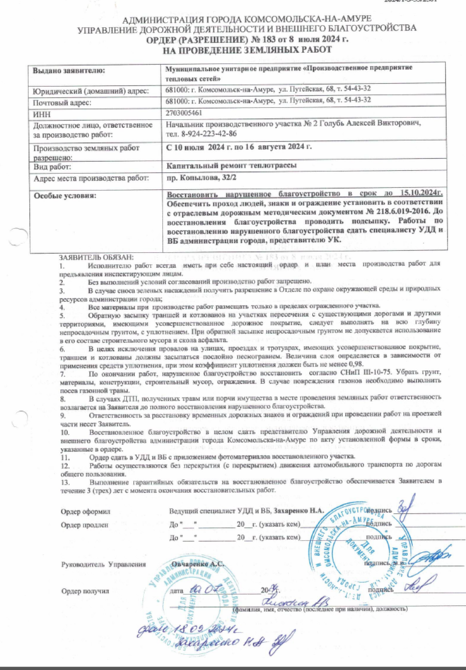 08.07.2024 года МУП «ППТС» был выдан ордер по адресу Копылова,32/2 на производство земляных работ по капитальному ремонту теплотрассы, ордер закрыт 18.09.2024, что подтверждается отметкой на ордере и актом о нарушении благоустройства (с подписью представителя управляющей компании) и фотоматериалами (приложение)